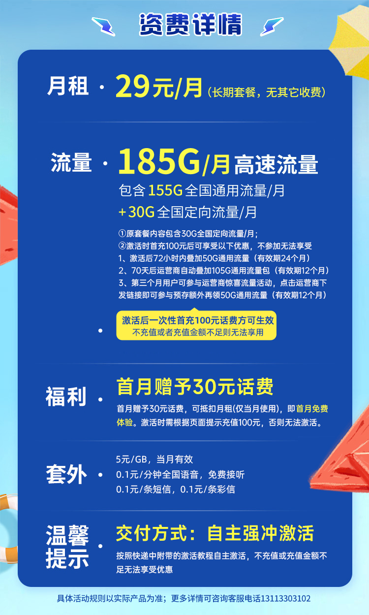 首要,让我们来了解一下这款流量卡的基本信息。它来自一家知名电信运营商,具有宽广的网络覆盖和安稳的信号质量。月费仅需29元,却供应了高达185GB的流量,满意应对大部分用户的日常需求。不论是阅览新闻、观看视频,仍是玩游戏、听音乐,这款流量卡都能让你畅享网络世界的乐趣。