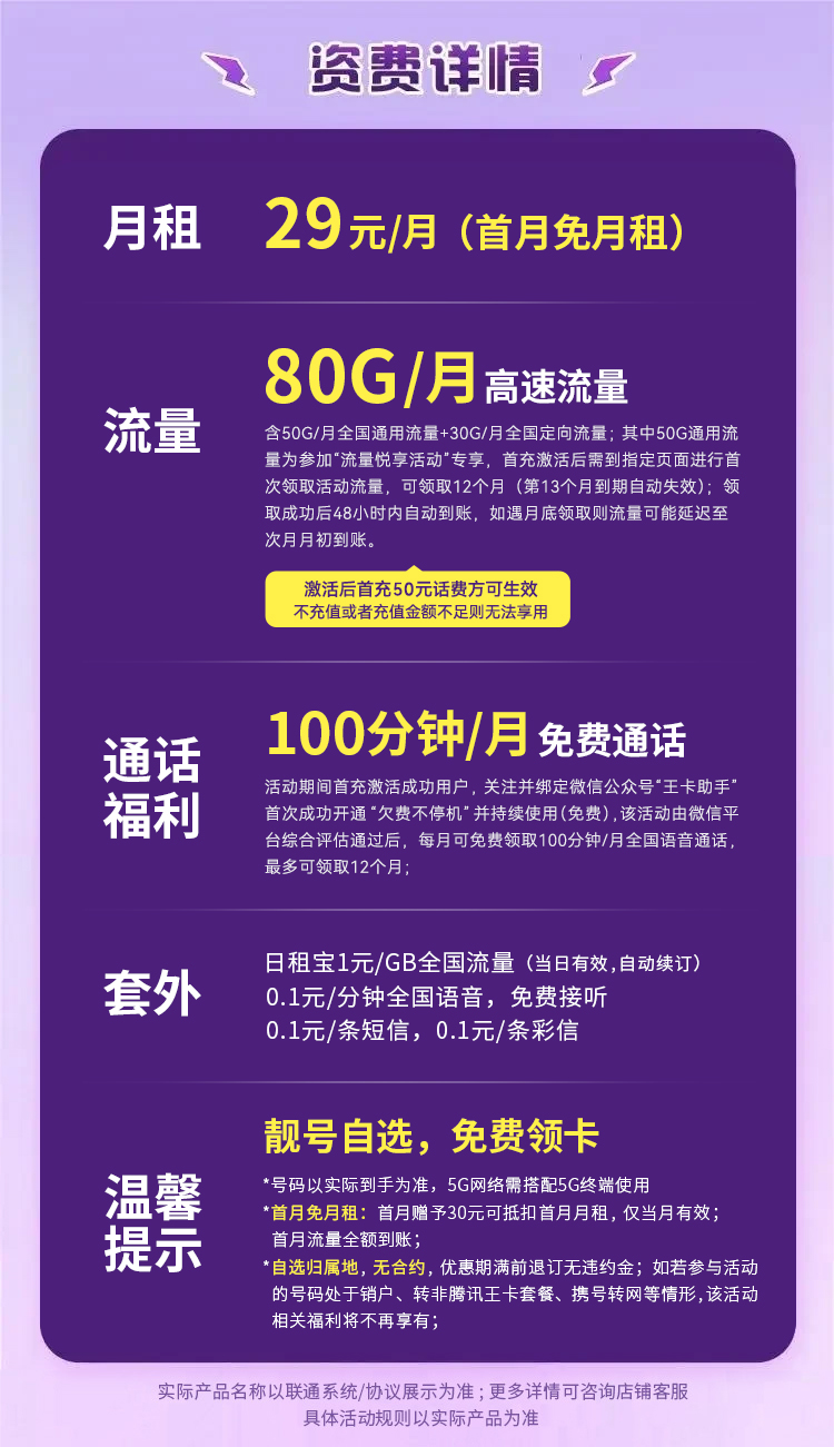 现在很多人用微信语音代替打电话,但如果你要经常接听作业电话,或者给长辈打电话,一定要选带通话时长的套餐。比方联通的“流量王卡”,29元月租包含80GB流量+100分钟通话,性价比超高。