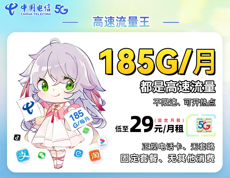 流量:155GB通用+30GB定向(覆盖腾讯视频、抖音等主流APP)